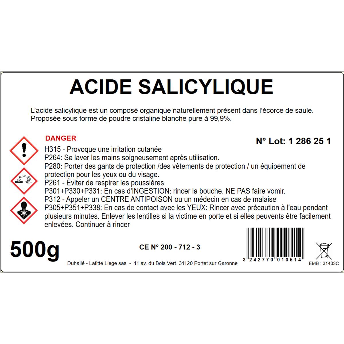 Acide Salicylique - Poudre Pure à 99,9% – 500 g – Grade Technique / Biocide